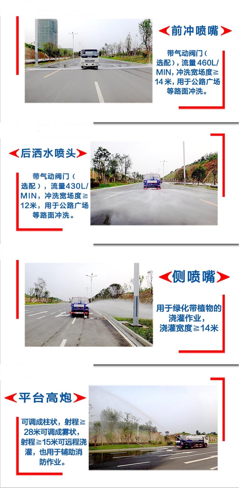 按罐體容積分:2噸灑水車,5噸灑水車,8噸灑水車,10噸灑水車,12噸灑水車,15噸灑水車,20噸灑水車,22噸灑水車