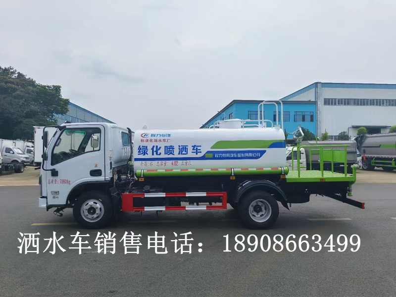 罐體有效容積5立方,罐體采用國標Q235碳鋼,罐體厚度4mm,自吸自排水泵,帶前沖裝置,后灑裝置,左右側噴裝置,尾部帶有安全操作平臺,帶消防接口,自流口,兩根輸水管,尾部綠化高炮,綠化高炮可調節直沖,大雨,中雨,毛毛雨霧,可以連續調節,360度旋轉;