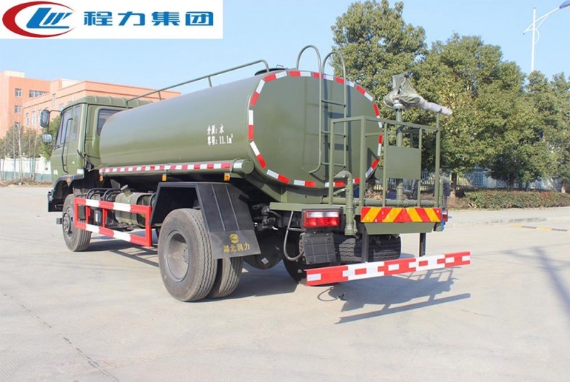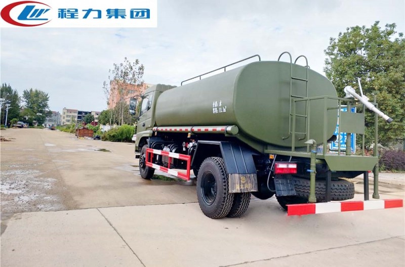 該車可做東風四驅沙漠運水車使用,罐裝有效容積13立方,采用優質碳鋼焊接而成,自動流水線罐體生產工藝分為:下料、拼板自動焊,封頭旋壓成型,罐體一次滾壓成型等國內先進生產工藝。帶前沖(噴)、后灑、后工作平臺,平臺上有高壓水炮(炮可360全方位旋轉,可連續調節為柱狀、開花狀、雨狀、半霧狀水流),配備大功率專用灑水泵,帶2根透明鋼絲抽水管,泵可自吸自排,帶過濾網,可從野外河流里抽水;帶消防接口,可從城市消防栓處取水;帶自流閥,可自然排水或者采用水泵進行加速排水。 東風四驅消防灑水車在設計上內置消防泵夾心取力器,泵倉位于罐體前部,隱藏設計,有倉門,有效容積為8.0立方,配專用大功率消防灑水車炮,最大射程30m