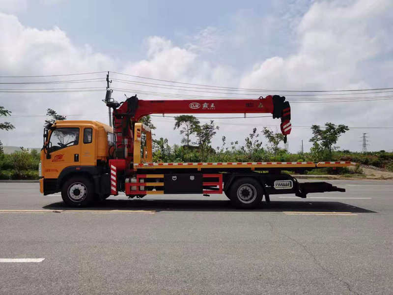 上裝配置:全8噸上裝,搭配8噸4節吊機,花紋板,雙側聯動操作裝置,8噸板,8噸后拖,8噸液壓絞盤,尾部液壓翻轉;八噸四節霸王吊,舉升高度15.5米,工作半徑13.5,全回轉, 上操作。